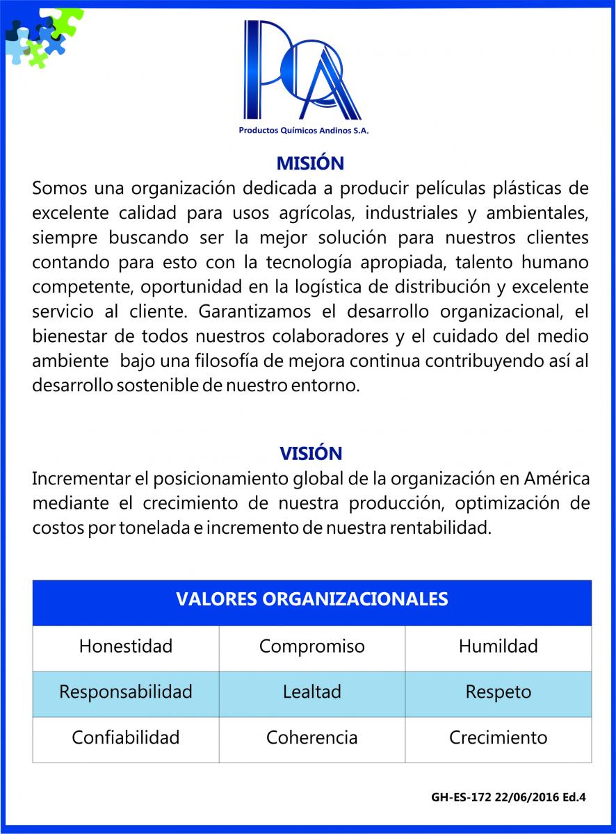 Productos Químicos Andinos S.A.SPQA es una empresa manufacturera ubicada en la ciudad de Manizales, Caldas, Colombia con más 25 años de experiencia y líder en la fabricación de películas coextruidas y pentaextruidas para aplicaciones en los sectores Agrícolas, Industriales y Comerciales. PQA cuenta con dos plantas productivas en Perú, ubicadas una, en la zona franca de Céticos, Paita, y la otra ubicada en el parque industrial Zofratacna, en Tacna, bajo la razón social Plásticos Agrícolas y Geomembrana S.A.C.. Otra planta productiva en México, ubicada en el parque Industrial Mazatlán, en Sinaloa bajo la razón social Plasticos Agrícolas y Geomembranas de México S.A. de C.V.
